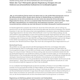 Heilbronn ist Teil der Metropolregion Stuttgart. Wie Ulm und Regensburg zeichnet sich Heilbronn vor allem durch seinen florierenden Arbeitsmarkt, aber auch durch seinen dynamischen Immobilienmarkt aus. Heilbronn weist eine große Anzahl an Handwerksbetrieben und einen breiten Mittelstand mit vielen Ausbildungsplätzen auf. So hat die Neckarstadt mit 5,3 Prozent den zweihöchsten Anteil an Auszubildenden an der Gesamtzahl der Beschäftigten aller deutschen Großstädte. Heilbronn fördert bereits seit der Jahrtausendwende technologieorientierte Start-Ups. Dazu wurde die Innovationsfabrik Heilbronn gegründet, die heute zirka 60 Unternehmen umfasst. Seit 2009 besteht der Zukunftspark Wohlgelegen, der Unternehmen in Zukunftsbranchen wie der IT oder Umwelttechnologie bündelt. Bei der Gründungsintensität erreicht Heilbronn auf diese Weise Rang 12. In der Bewertung des Immobilienmarkts erzielt die Stadt Rang 8 im bundesweiten Großstadtvergleich. Stärkster Indikator ist die Anzahl der erteilten Baugenehmigungen für Wohnungen in Relation zu den Bestandswohnungen mit Platz 4. „Heilbronn erlebte nach Berlin die zweithöchste Steigerung Mietpreise aller deutschen Großstädte in Höhe von 32 Prozent im Zeitraum von 2015 bis 2020. Daher sind Baugenehmigungen für den Neubau und eine hohe Quote an Baufertigstellungen sehr wichtig, um bezahlbaren Wohnraum zu erhalten“, erläutert Ralf Weitz, Geschäftsführer von ImmoScout24 die Situation der Regionalzentren im Immobilienmarkt.