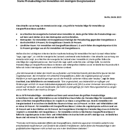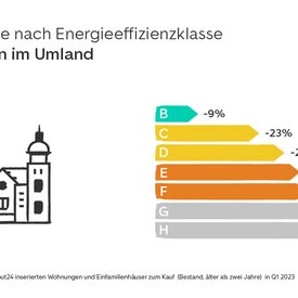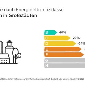 In kreisfreien Klein- und Mittelstädten sowie im ländlichen Raum fallen die Preisabschläge für Immobilien mit einer schlechten Energieeffizienzklasse im Vergleich zur Klasse A am größten aus. Bereits Immobilien mit Energiestandard B verzeichnen im ländlichen Raum ein Minus von 16 Prozent. In Klein- und Mittelstädten sind es minus 19 Prozent. Für Immobilien mit Energieeffizienzklasse C sinken die Angebotspreise auf dem Land um 25 Prozent und in den Städten um 30 Prozent. Bei Energieklasse D beträgt der Preisabschlag etwa ein Drittel im Vergleich zu Immobilien mit Energieklasse A. Für Immobilien mit der schlechtesten Energieeffizienzklasse H fallen die Angebotspreise in den Klein- und Mittelstädten im Durchschnitt um 45% niedriger aus. Im ländlichen Raum sind mit minus 51 Prozent mehr als die Hälfte.