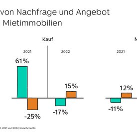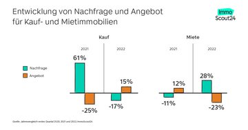 Stattdessen suchen dieses Jahr wieder deutlich mehr Menschen nach Immobilien zur Miete. War die Nachfrage nach Wohnimmobilien zur Miete vom ersten Quartal 2020 zum ersten Quartal 2021 noch um 11 Prozent gefallen, liegt sie im ersten Quartal 2022 um 28 Prozent über dem Vorjahreswert. Als Folge dieser Entwicklung ist das verfügbare Angebot von Mietobjekten in diesem Zeitraum um 23 Prozent zurückgegangen, während das Angebot von Immobilien zum Kauf im gleichen Zeitraum um 15 Prozent angestiegen ist.