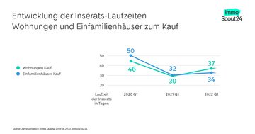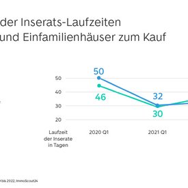 Für die Analyse der Entwicklung des Angebots und der Nachfrage hat ImmoScout24 die Entwicklung der Kontaktanfragen zu den Inseraten im Jahresvergleich des ersten Quartals 2020, 2021 und 2022 sowie die Laufzeiten der Inserate auf dem eigenen Online-Marktplatz ausgewertet. Berechnungsgrundlage dafür ist die durchschnittliche Anzahl der Kontaktanfragen, die Anbieter:innen zu ihren Inseraten in der jeweiligen Kategorie innerhalb der ersten sieben Tagen erhalten. Als Angebot wurde der gesamte Bestand der Immobilieninserate bei ImmoScout24 zu einem Stichtag am Ende des jeweiligen Betrachtungszeitraums zugrunde gelegt, nicht nur Neuinserate. Basis der Angaben zu den Laufzeiten der Inserate ist der Medianwert aller im entsprechenden Quartal deaktivierten Immobilieninserate deutschlandweit.
