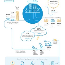 Nach dem Ursprung ihrer Immobilie befragt, gaben 86 Prozent der Befragten an, das Objekt aktiv gekauft zu haben. Neun Prozent haben die zu vermietende Immobilien geerbt und fünf Prozent bekamen diese geschenkt. 56 Prozent standen dem Kauf eines weiteren Mietobjektes offen gegenüber und gaben an, dass sich die Investition in eine weitere Immobilie lohnen könne. 63 Prozent der befragten Vermieter verwalten ihr Eigentum selbstständig. Eine Hausverwaltung übernimmt für 19 Prozent der Vermieter die gesamte Abwicklung. 18 Prozent lassen sich zumindest von einer Hausverwaltung unterstützen. Bei dem Thema Nachmieter sind 37 Prozent der Vermieter damit einverstanden, dass der aktuelle Mieter diesen vorschlägt. Zwei Drittel der Befragten (63 Prozent) sucht sich hingegen ihre Mieter selber aus.