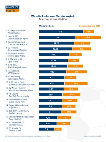 ImmobilienScout24 nimmt den Bundesliga-Start zum Anlass, die Nachbarschaft der Stadien als Wohnorte unter die Lupe zu nehmen. Was kosten Miet- oder Eigentumswohnungen am spannendsten Fußballplatz der Stadt?