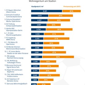 Eigentumswohnungen in der Nachbarschaft der Red Bull Arena in Leipzig haben sich seit 2015 um 64 Prozent auf durchschnittlich 2.821 Euro pro Quadratmeter verteuert. Ob es mit dem Aufstieg 2016 zusammenhängt? Wohl kaum, der Leipziger Immobilienmarkt boomt insgesamt. Auch in Berlin boomt der Wohnungsmarkt. Rund um das Stadion an der alten Försterei des aktuellen Aufsteigers FC Union Berlin sind die Kaufpreise in den vergangenen vier Jahren um 47 Prozent auf 2.901 Euro pro Quadratmeter im Schnitt gestiegen. Köln, mit dem FC wieder aufgestiegen zur neuen Saison, bleibt seiner Karnevalstradition treu: Die Schnapszahl 3.333 Euro zahlt der jecke Fan pro Quadratmeter Eigentumswohnung im Schnitt rund ums RheinEnergieStadion.