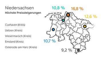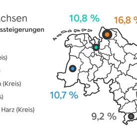 Die Mietpreise sind innerhalb eines Jahres vielerorts in Niedersachen gestiegen. ImmoScout24 hat den Mietwohnungsmarkt in Niedersachsen analysiert und untersucht, wo die Preise stiegen oder rückläufig waren.