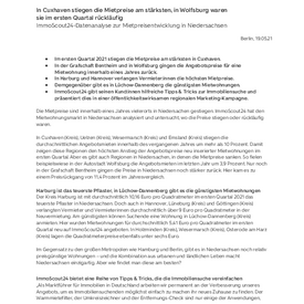 In Cuxhaven (Kreis), Uelzen (Kreis), Wesermarsch (Kreis) und Emsland (Kreis) stiegen die durchschnittlichen Angebotsmieten innerhalb des vergangenen Jahres um mehr als 10 Prozent. Auch im ersten Quartal zeigen diese Regionen den höchsten Anstieg der Angebotspreise neu inserierter Mietwohnungen. Aber es gibt auch Regionen in Niedersachen, in denen die Mietpreise sanken. So fielen beispielswiese in der Autostadt Wolfsburg die Angebotsmieten im letzten Jahr um 3,9 Prozent. Nur noch in der Grafschaft Bentheim gingen die Preise in Niedersachsen noch stärker zurück. Hier kam es zu einem Preisrückgang von 11,4 Prozent im Jahresvergleich. Die Datenbasis für diesen Kreis ist relativ gering und zeigt damit eine volatile Momentaufnahme.