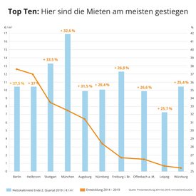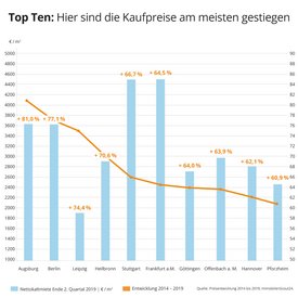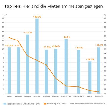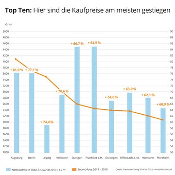Nirgendwo zogen die Mietpreise in den vergangenen fünf Jahren so stark an wie in Berlin. Von 2014 bis 2019 stiegen sie um 37,5 Prozent (Durchschnitt der Städtetest-Großstädte: 18,9 Prozent). Auch die Preise für Berliner Eigentumswohnungen entwickeln sich sehr dynamisch und kletterten um 77,1 Prozent (Durchschnitt: 46,5 Prozent). Nur in Augsburg wuchsen die Preise für Eigentumswohnungen mit 81,0 Prozent noch mehr. Leipziger Eigentumswohnungen stehen auf Rang 3 mit einer Preissteigerung von 74,4 Prozent in fünf Jahren. Die geringsten Preissteigerungen erlebten Cottbus mit 24,3 Prozent sowie die beiden Ruhrgebietsstädte Gelsenkirchen mit 21,5 Prozent und Hagen mit 16,3 Prozent.