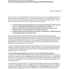 Die stärkste Nachfrageentwicklung verzeichnet Minden mit einem Plus von 95 Prozent. Auch in Bottrop (+60 Prozent) nimmt das Kaufinteresse deutlich zu. Augsburg ist mit einem Quadratmeterpreis von 4.531 Euro die teuerste und zugleich größte Stadt unter den zehn Regionalzentren mit besonders dynamischer Nachfrage (+36 Prozent). Ein Nachfrageanstieg von mehr als 40 Prozent zeigt sich zudem in Offenbach am Main (+42 Prozent), Würzburg (+41 Prozent) und Göttingen (+44 Prozent). In diesen Städten lag die Preisentwicklung im vergangenen Jahr zwischen +2,1 und +4,5 Prozent.