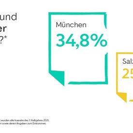 In München kalkulieren Mietinteressenten allerdings knapp 35 Prozent ihres Nettohaushaltseinkommen für die monatliche Miete ein. Trotz des Rückgangs der Wohnkosten um 0,3 Prozentpunkte, nimmt die bayerische Hauptstadt den Spitzenplatz im Städtevergleich ein. Innerhalb von fünf Jahren stiegen in München die Angebotsmieten um 25 Prozent auf 17,63 Euro pro Quadratmeter im zweiten Quartal 2021. Damit ist München das teuerste Pflaster für Mietwohnungen im Gesamtdurchschnitt ohne Unterscheidung zwischen Neu- und Altbau. In Heilbronn planen Suchende 34,3 Prozent ihres Einkommens für die eigene Mietwohnung ein. Auch in Oldenburg und Ludwigshafen am Rhein liegt der Wohnkostenanteil mit knapp 34 Prozent auf Spitzenplatz-Niveau – bei allerdings noch relativ günstigen Quadratmeterpreisen von durchschnittlich 8,44 Euro und 9,03 Euro. Die Nachfrage übersteigt hier deutlich das Angebot. Den niedrigsten Anteil ihres Haushaltsnettoeinkommens ziehen Mietsuchende in Salzgitter mit 25,9 Prozent, in Gelsenkirchen mit 26,1 Prozent und Jena mit 26,5 Prozent in Betracht.