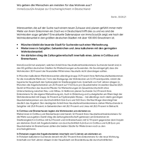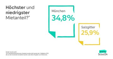 „Als Faustregel gilt, dass die Miete nicht höher als 30 Prozent des monatlichen Haushaltsnettoeinkommens sein sollte. Unsere Datenanalyse zeigt, dass damit Mietsuchende nur noch in einem Drittel der Städte kalkulieren. Berlin sticht als einzige Metropole mit einer Zahlungsbereitschaft von 28 Prozent für das Wohnen heraus. In München sind Suchende hingegen bereit bis zu 35 Prozent des Einkommens für die eigene Wohnung aufzubringen“, erläutert Dr. Thomas Schroeter, Geschäftsführer von ImmoScout24.