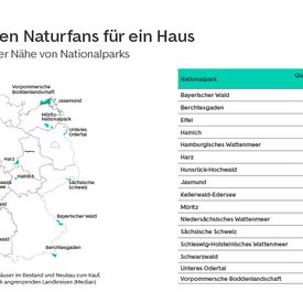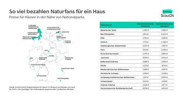 Die Preise für Häuser in der Nähe deutscher Nationalparks zeigen eine Bandbreite von 1.779 Euro bis 4.614 Euro pro Quadratmeter bei den Kaufpreisen für Einfamilienhäusern im Bestand. Dabei handelt es sich durchweg um ländliche Regionen mit naturnahen Wohnlagen. Im Vergleich dazu kostet ein Bestandshaus in Deutschland durchschnittlich 2.846 Euro pro Quadratmeter. Bei Neubauten bewegen sich die Preise zwischen 2.486 Euro und 5.402 Euro pro Quadratmeter (deutscher Durchschnitt: 3.883 Euro).