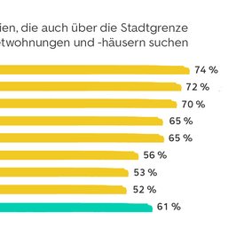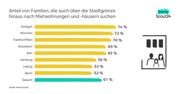 61 Prozent aller Familien suchen in den acht größten Städten in Deutschland jenseits der Stadtgrenzen. Fast drei von vier Familien sind es in Stuttgart (74 Prozent) und München (72 Prozent). Weniger sind es in Berlin (52 Prozent), Leipzig (53 Prozent) und in Hamburg (56 Prozent). Eine ImmoScout24-Analyse zeigte im März 2024, wie das verstärkte Suchaufkommen im Umland zum Teil die Preise stärker steigen lässt als in den Metropolen – wenngleich es immer noch deutliches Einsparpotential gibt.