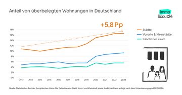 Bei der Suche von Familien wurden die Angaben in den Suchprofilen und Ansichten der Inserate für Mietwohnungen bei ImmoScout24 im ersten Quartal 2024 ausgewertet. Der Anteil der Mietwohnungen mit vier oder mehr Wohnräumen ist anhand der Inserate bei ImmoScout24 für das Jahr 2023 bzw. 2012 berechnet. Die durchschnittliche Anzahl der Räume pro Wohneinheit in neu fertiggestellten Mehrfamilienhäusern wird vom Statistischen Bundesamt ermittelt. Die Zahlen für das Jahr 2023 zeigt die durchschnittliche Raumanzahl in genehmigten Bauprojekten. Überbelegt ist ein Haushalt unter anderem, wenn ein Paar oder eine alleinstehende Person ab 18 über kein eigenes Zimmer verfügt. Die Definition erfolgt entsprechend der EU-SILC Erhebung von Eurostat.