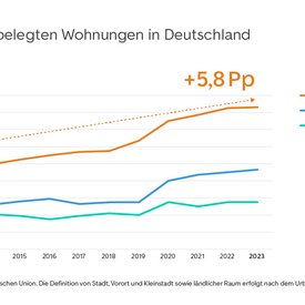 In Städten gilt jede sechste Wohnung als überbelegt (16,6 Prozent). Das zeigen Daten des Europäischen Amtes für Statistik (Eurostat). Das ist zwar weniger als der Durchschnitt in der Europäischen Union (19,5 Prozent im Jahr 2022). Doch während seit 2012 die Überbelegung in der EU leicht sinkt, hat der Anteil überbelegter Stadtwohnungen in Deutschland im selben Zeitraum um 5,8 Prozentpunkte zugenommen. Ein ähnlicher Trend zeichnet sich in den Vororten und Kleinstädten ab. Hier hat sich der Anteil überbelegter Wohnungen von 4,8 Prozent im Jahr 2012 auf 9,3 Prozent im Jahr 2023 nahezu verdoppelt.