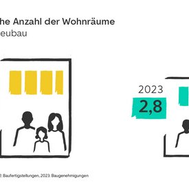 - Die durchschnittliche Anzahl von Wohnräumen in fertiggestellten Wohneinheiten sank von 3,5 Zimmern im Jahr 2012 auf 2,8 Zimmer im Jahr 2023.