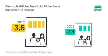 Der Anteil von angebotenen Mietwohnungen mit vier oder mehr Zimmern ist unter 10 Prozent gesunken. Deutschlandweit lag der Anteil 2023 bei 9,9 Prozent. 2012 hatten noch 12,2 Prozent aller bei ImmoScout24 inserierten Mietwohnungen vier oder mehr Zimmer. In den Metropolen haben 2023 nur 6,9 Prozent der zur Miete angebotenen Wohnungen vier oder mehr Wohnräume. 2012 waren es noch 10 Prozent. Auch beim Neubau geht der Trend zu weniger Räumen pro Wohnung, wie die Daten des Statistischen Bundesamtes zeigen. 2012 hatten fertiggestellte Wohnungen in Mehrfamilienhäusern durchschnittlich 3,6 Wohnräume. Im Jahr 2023 genehmigte Wohnungen werden im Schnitt nur noch 2,8 Räume bieten.