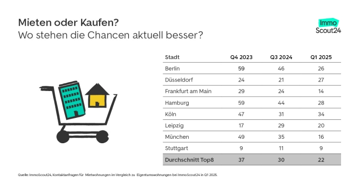 Die Auswertung vergleicht die Anzahl der Kontaktanfragen für Miet- und Eigentumswohnungen in den Top-8 Metropolen Deutschlands. Berücksichtigt wurden alle Kontaktanfragen, die bei ImmoScout24 im vierten Quartal 2023, dritten Quartal 2024 und ersten Quartal 2025 eingegangen sind. Die Zahlen geben das Verhältnis der Kontaktanfragen für Miet- vs. Kaufobjekte wieder.