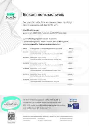 - Nach erfolgreichem Login werden deine Zahlungseingänge geprüft und dein Einkommensnachweis wird erstellt. Das Dokument ist anschließend Teil deiner Bewerbermappe, mit dem du Vermieter:innen Einkommenszahlungen nachweisen kannst. Neben deinem Namen und deiner Anschrift findet sich auf dem Dokument auch das Ausstellungsdatum.
