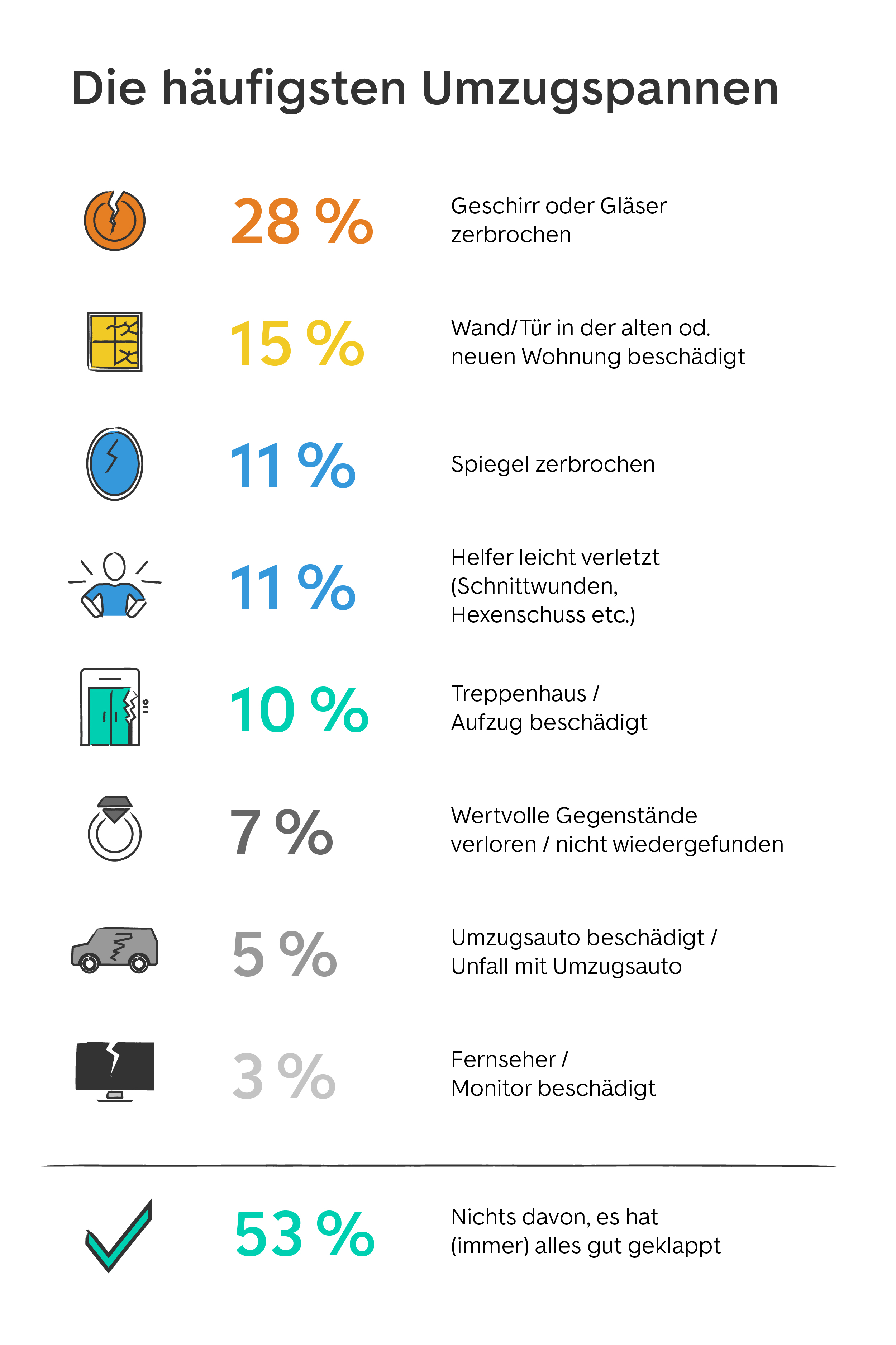 Eine Umfrage unter Nutzer:innen von ImmoScout24 ergab, dass 91,5 Prozent all derjenigen, die ein Umzugsunternehmen schonmal genutzt haben, es auch weiterempfehlen würden. Trotzdem haben laut der Umzugsstudie 2021 der Deutschen Post bisher nur 20 Prozent auf die Hilfe von Profis zurückgegriffen.
