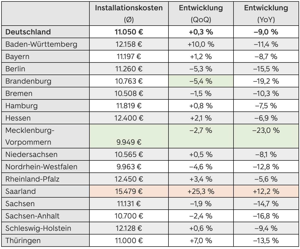 In Mecklenburg-Vorpommern kosten Komplettanlagen ein Drittel weniger als noch vor einem Jahr (–36,8 Prozent). Auch in Thüringen (–27,3 Prozent) und Baden-Württemberg (–25,5 Prozent) zeigt sich eine ausgeprägte Preisreduktion. Bei Komplettsystemen fällt der Rückgang im Saarland mit –1,5 Prozent deutlich schwächer aus als im Bundesdurchschnitt.