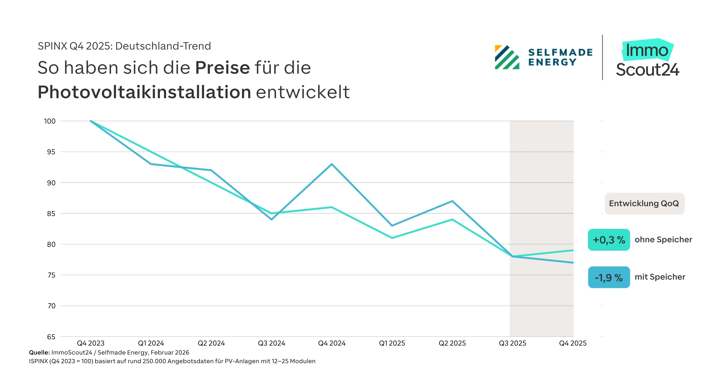 Der aktuelle Solarpreisindex (SPINX) von Selfmade Energy und ImmoScout24 zeigt damit einen klaren Abwärtstrend bei den Installationskosten. Während sich die Preise im Bundesdurchschnitt im Quartalsvergleich stabil bis leicht rückläufig entwickeln, profitieren insbesondere Eigentümer:innen im Osten und Norden von deutlichen Preisnachlässen.