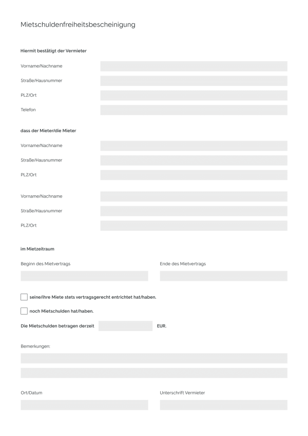 Es gibt keine gesetzlichen Regelungen, was genau in einer Mietschuldenfreiheitsbescheinigung stehen muss. Um ihren Zweck zu erfüllen, sind folgende Angaben aber sinnvoll: