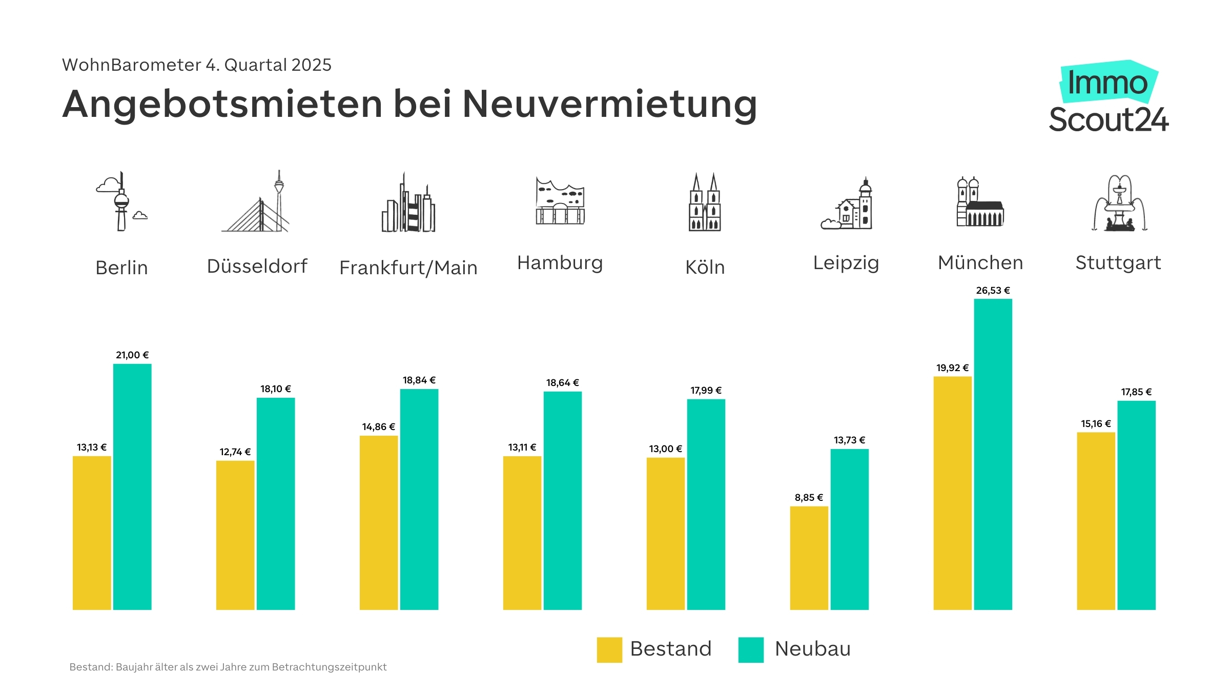 Das ImmoScout24 WohnBarometer ist der Marktreport zur Entwicklung des Immobilienmarkts. Herausgeber ist ImmoScout24: Deutschlands führende Online-Plattform für Wohnimmobilien. Das ImmoScout24 WohnBarometer gibt die Preisentwicklung in realen Angebotspreisen wieder. Die Datenbasis umfasst über 8,5 Millionen Inserate der letzten fünf Jahre auf ImmoScout24. Die Werte werden für Referenzobjekte für den jeweils betrachteten Immobilientyp durch einen Algorithmus aus dem Bereich des maschinellen Lernens ermittelt. Für Wohnungen zum Kauf wird eine Drei-Zimmer-Wohnung mit 80 Quadratmetern Wohnfläche zugrunde gelegt. Das betrachtete Einfamilienhaus hat 140 Quadratmeter Wohnfläche und einen Grundstücksanteil von 600 Quadratmetern. Die Kategorie Neubau enthält alle Angebote mit einem Baualter von maximal zwei Jahren zum jeweiligen Bestimmungszeitpunkt. Die aktuellen Angebotskaufpreise beziehen sich immer auf den letzten Datenpunkt im Marktreport und stehen damit für den Angebotspreis im vierten Quartal 2025.