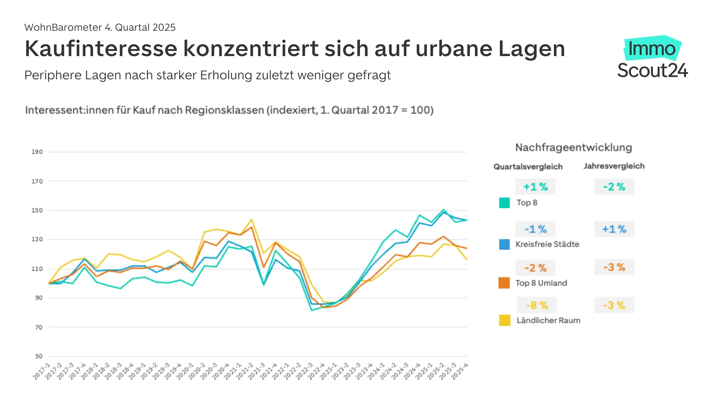 - Kaufnachfrage konzentriert sich zunehmend auf Städte: Top-8-Metropolen gewinnen im vierten Quartal 2025 (+1 Prozent), während das Interesse im ländlichen Raum deutlich abnimmt (-8 Prozent).